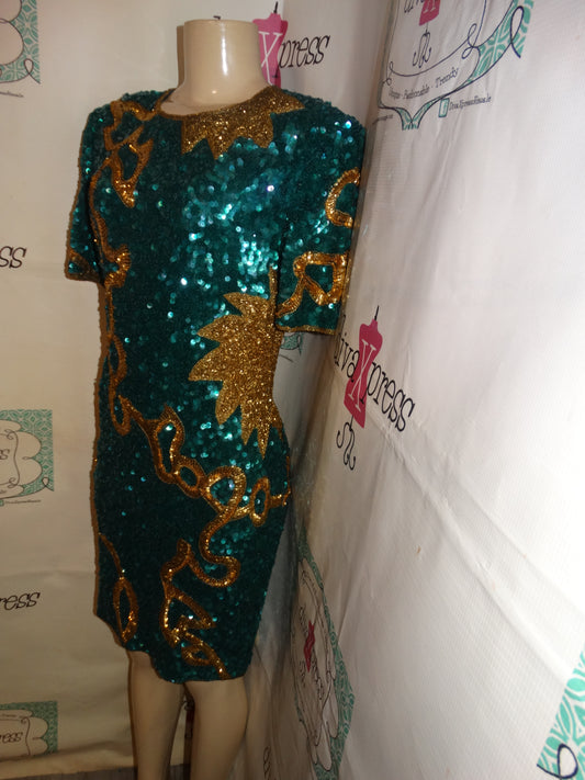 Vintage Lawerence KAzar Green/Gold Sequins Dress Size M