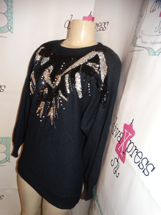 Vintage Leslie Knits Black Sequins Sweater Size L