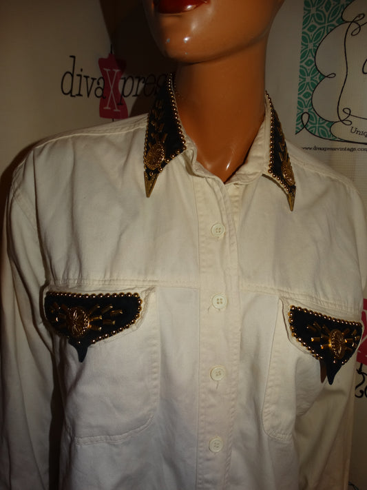 Vintage LOOK NYE Cream Beaded Collar Top Size L