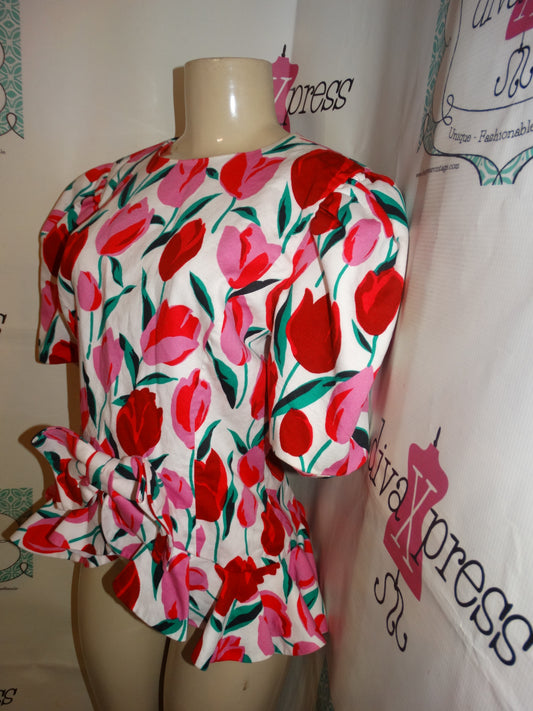 Vintage Raul Lanco White Pink Floral Peplum Blouse Size S