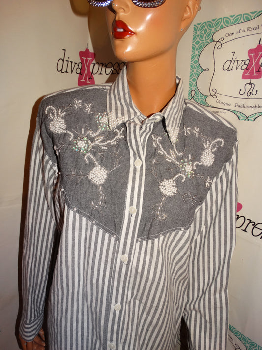 Vintage Jane Ashley Gray/White BEaded Top Size M