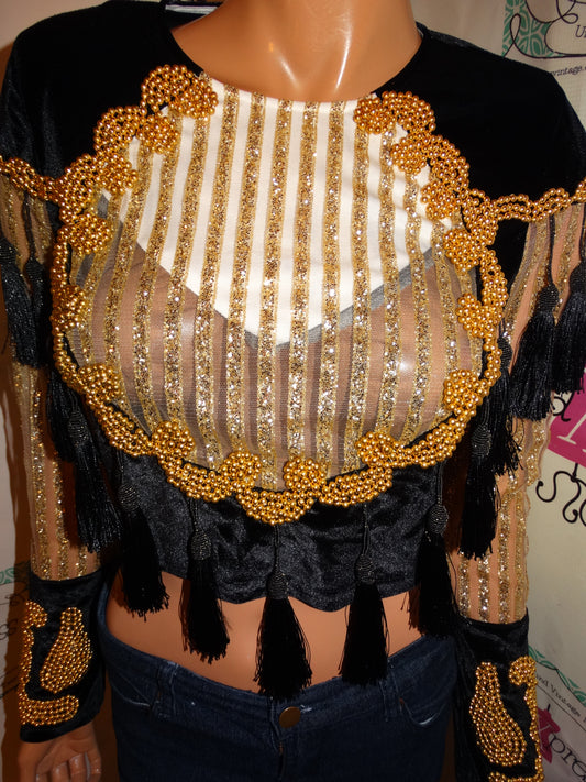 Vintage O dressy Black/Gold Beaded Shingle Crop Top Size S