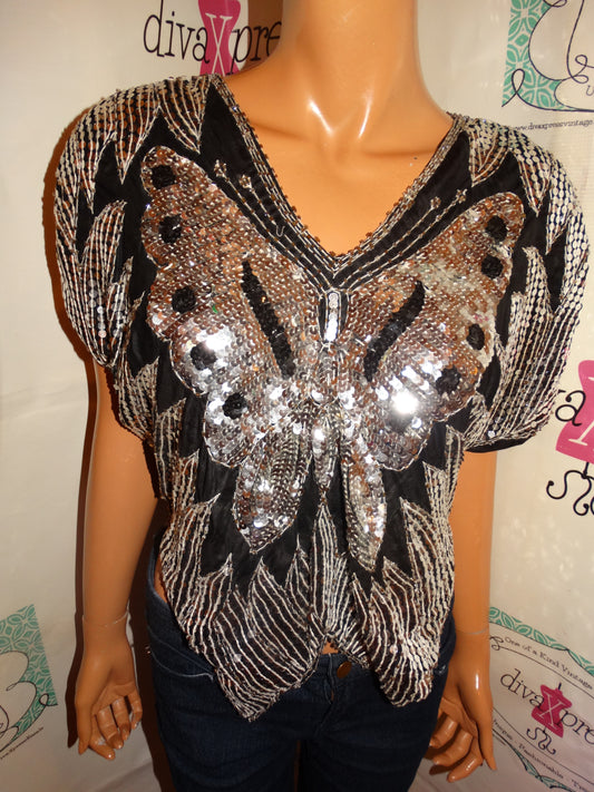 Vintage Sliver Sequins Butter Fly Blouse Size S