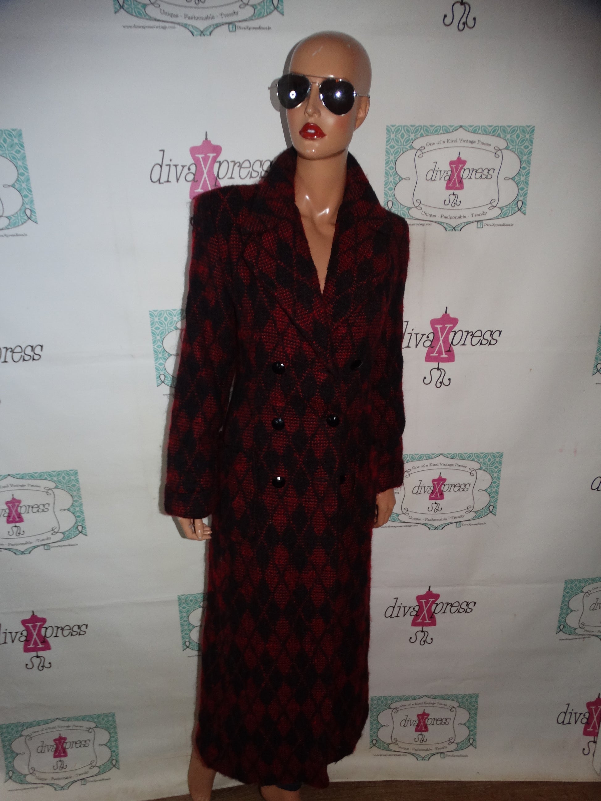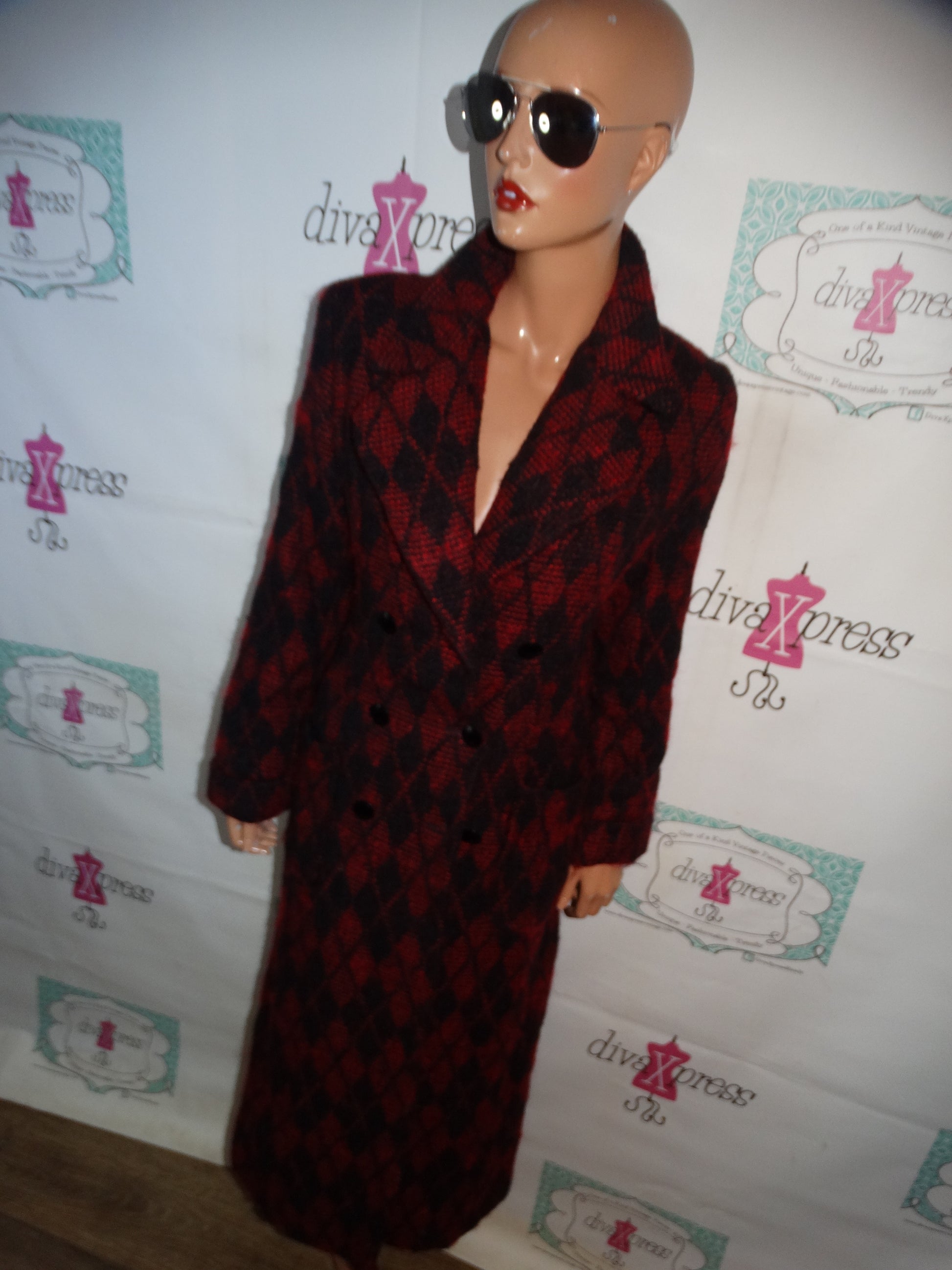 Up for sale is this lovely Vintage Bisu Bisou Black/Red Long Wool Coat Size M