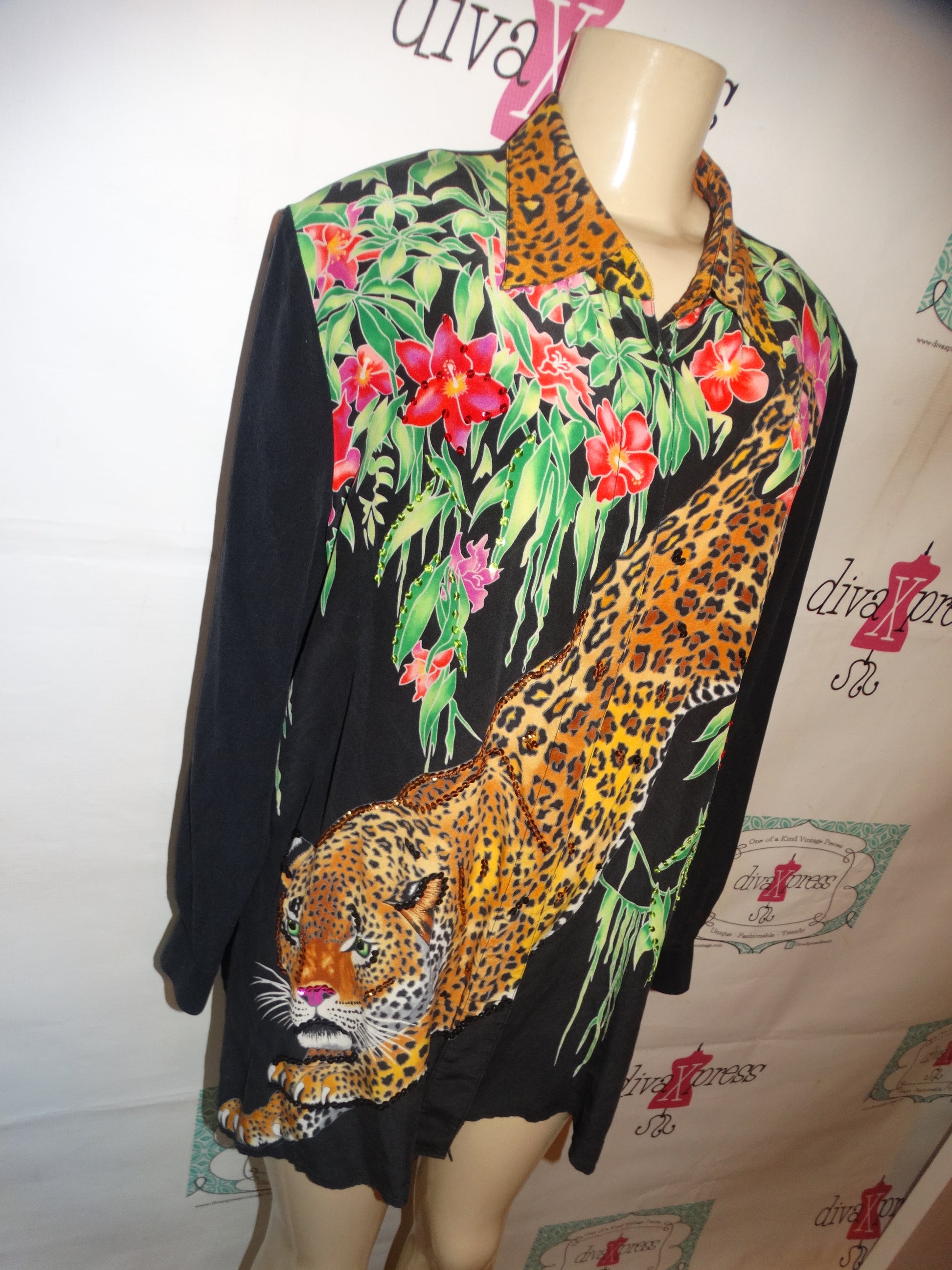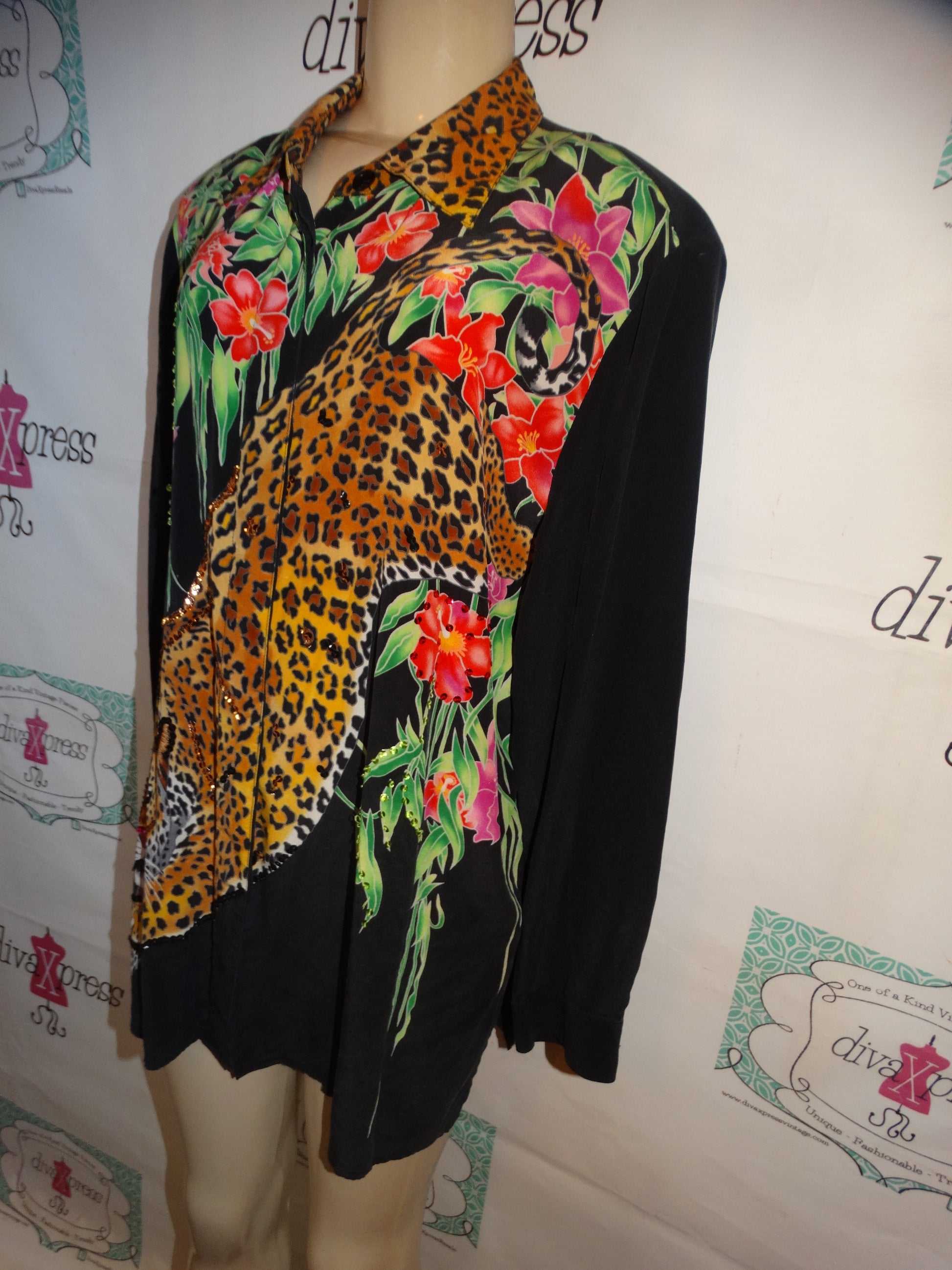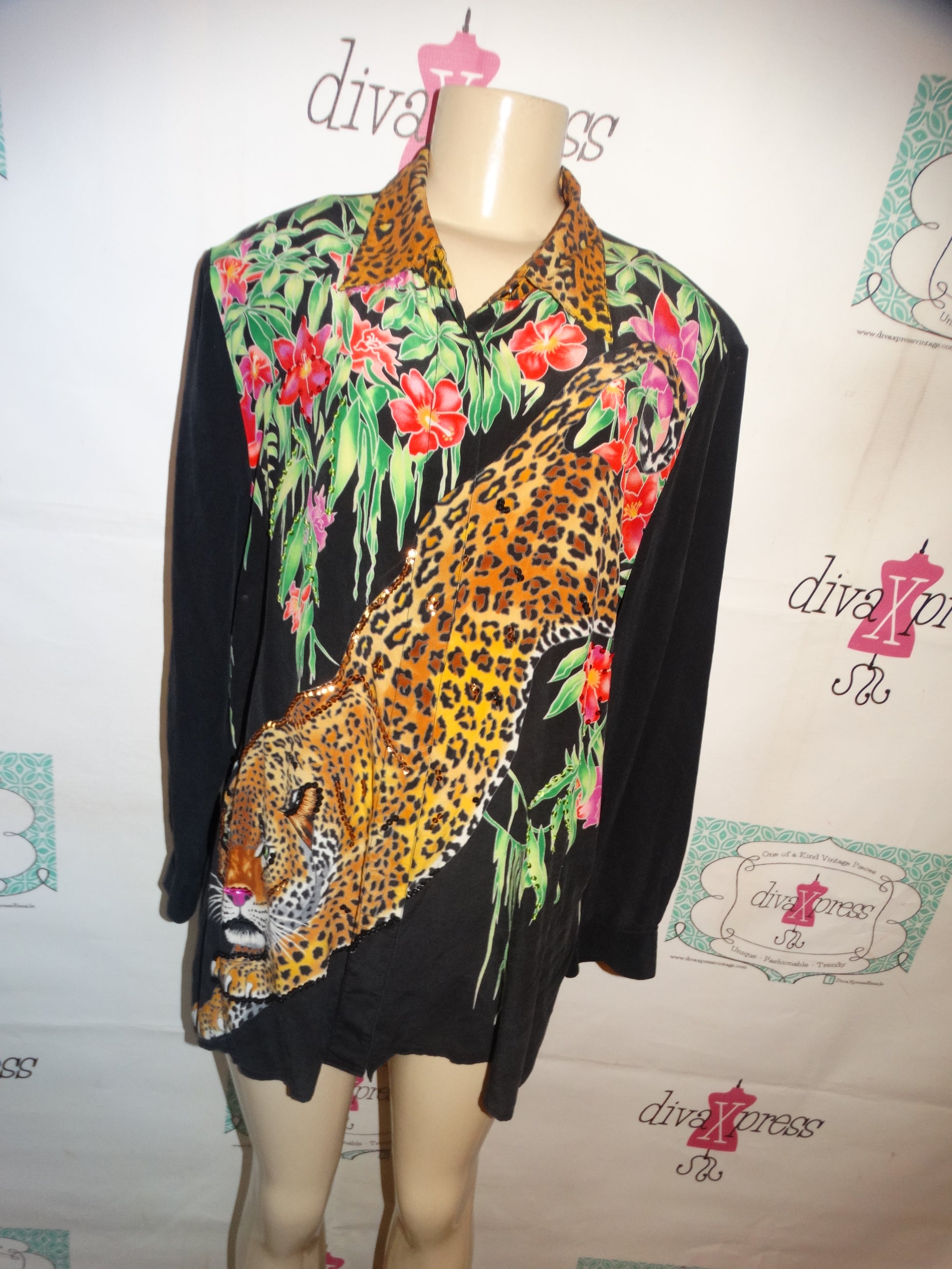 Vintage Diane Gilman Black Silk Tiger Beaded Blouse Size 2x