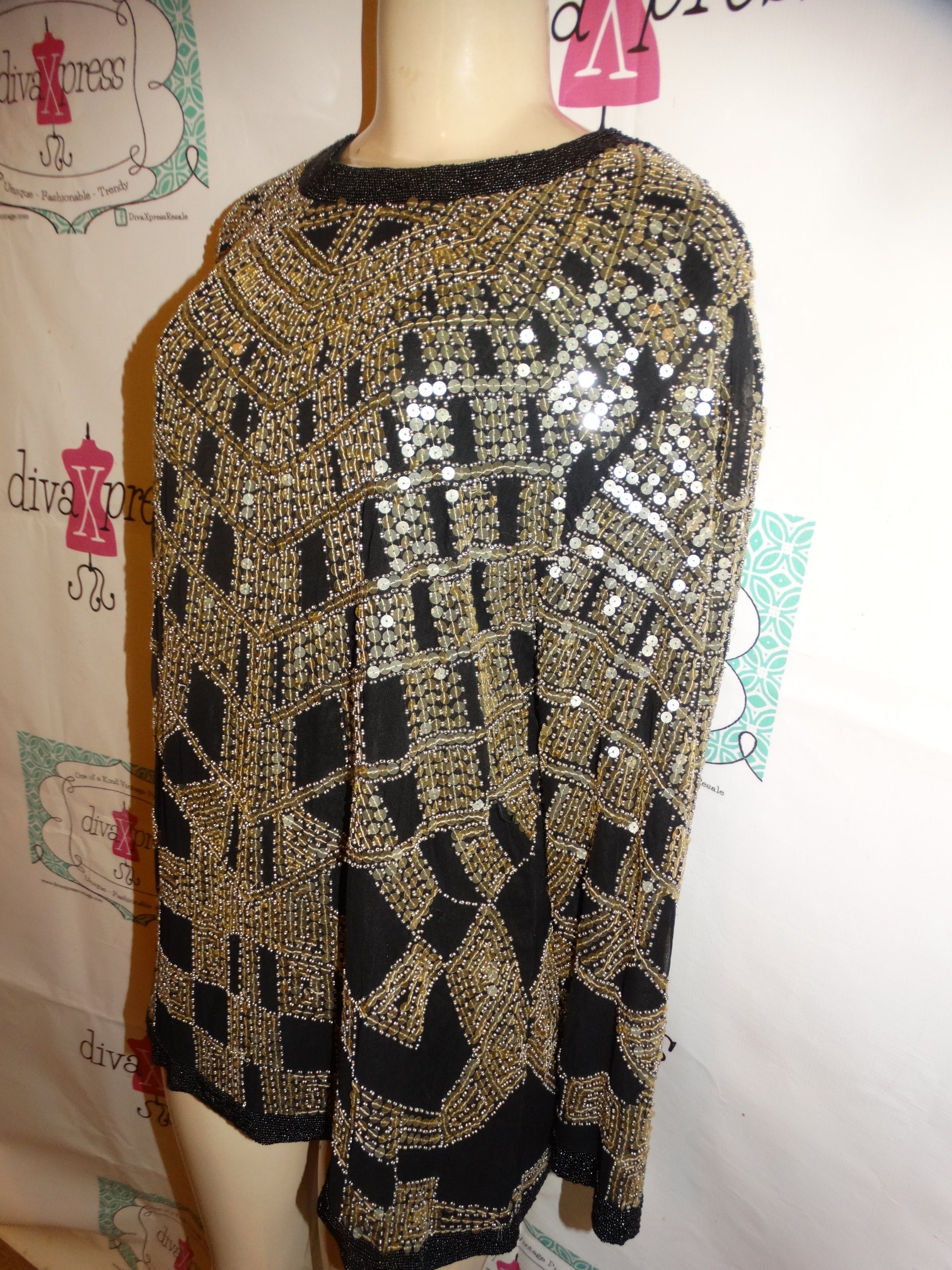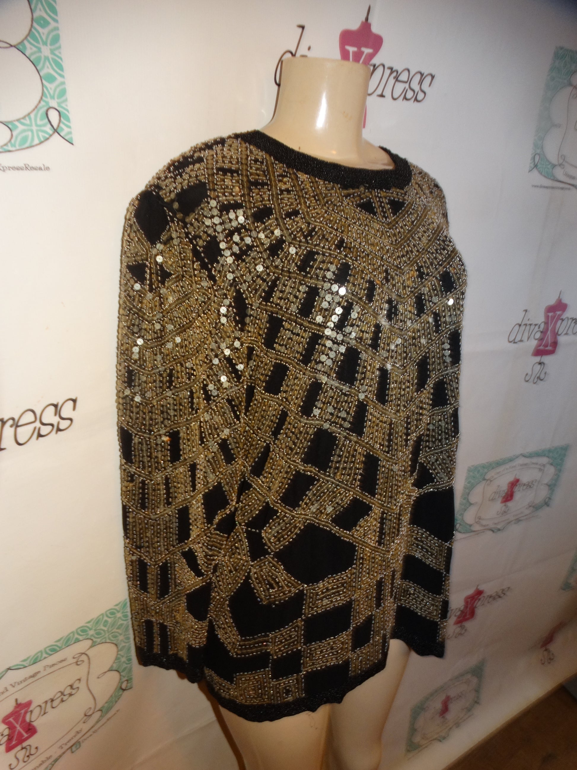 Up for sale is this lovely Vintage Oleg Cassini Black Gold Sequins Top Size XL