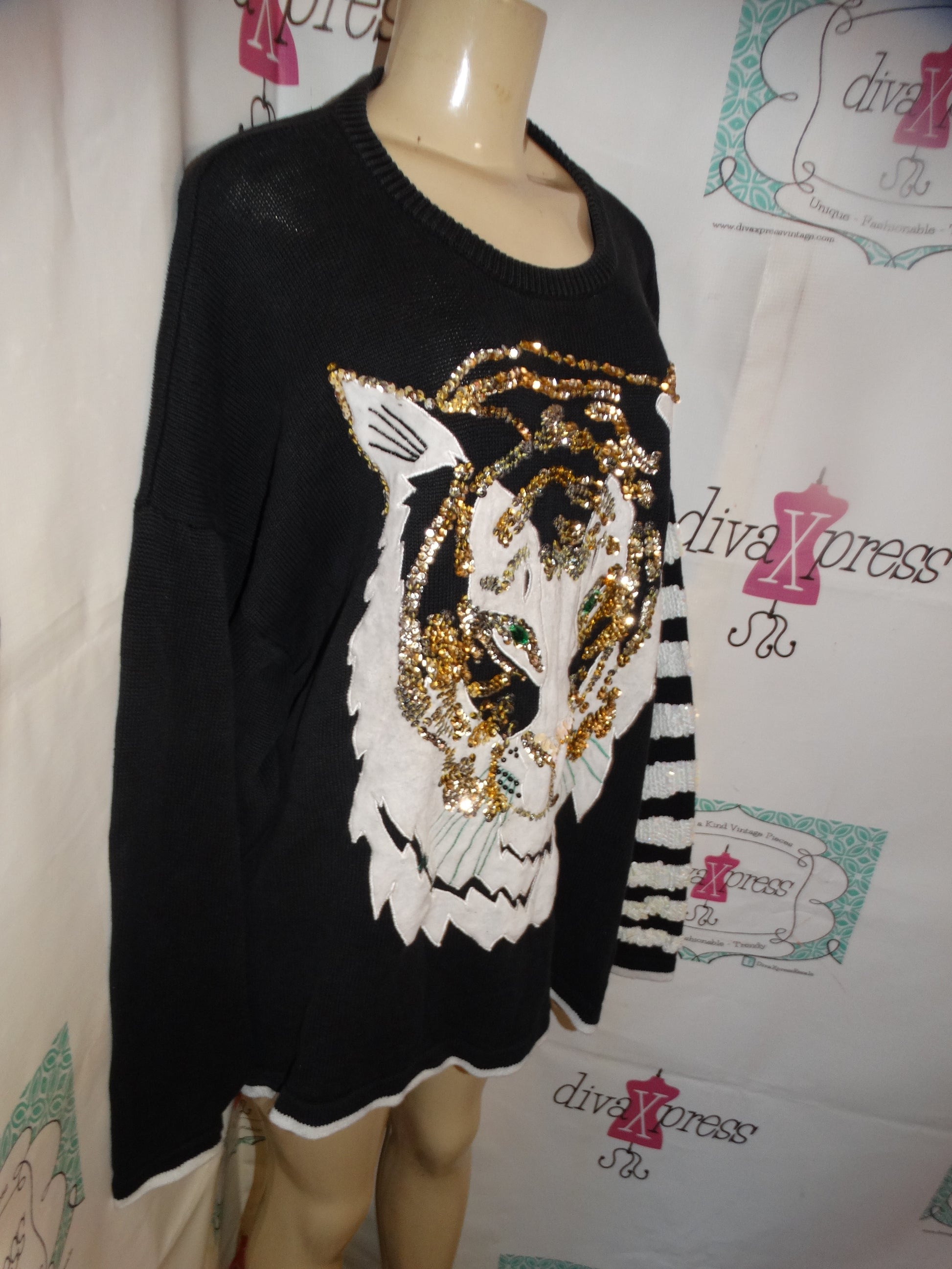 Vintage Sandy Jo Black Tiger White Sequins Sweater Size 3x