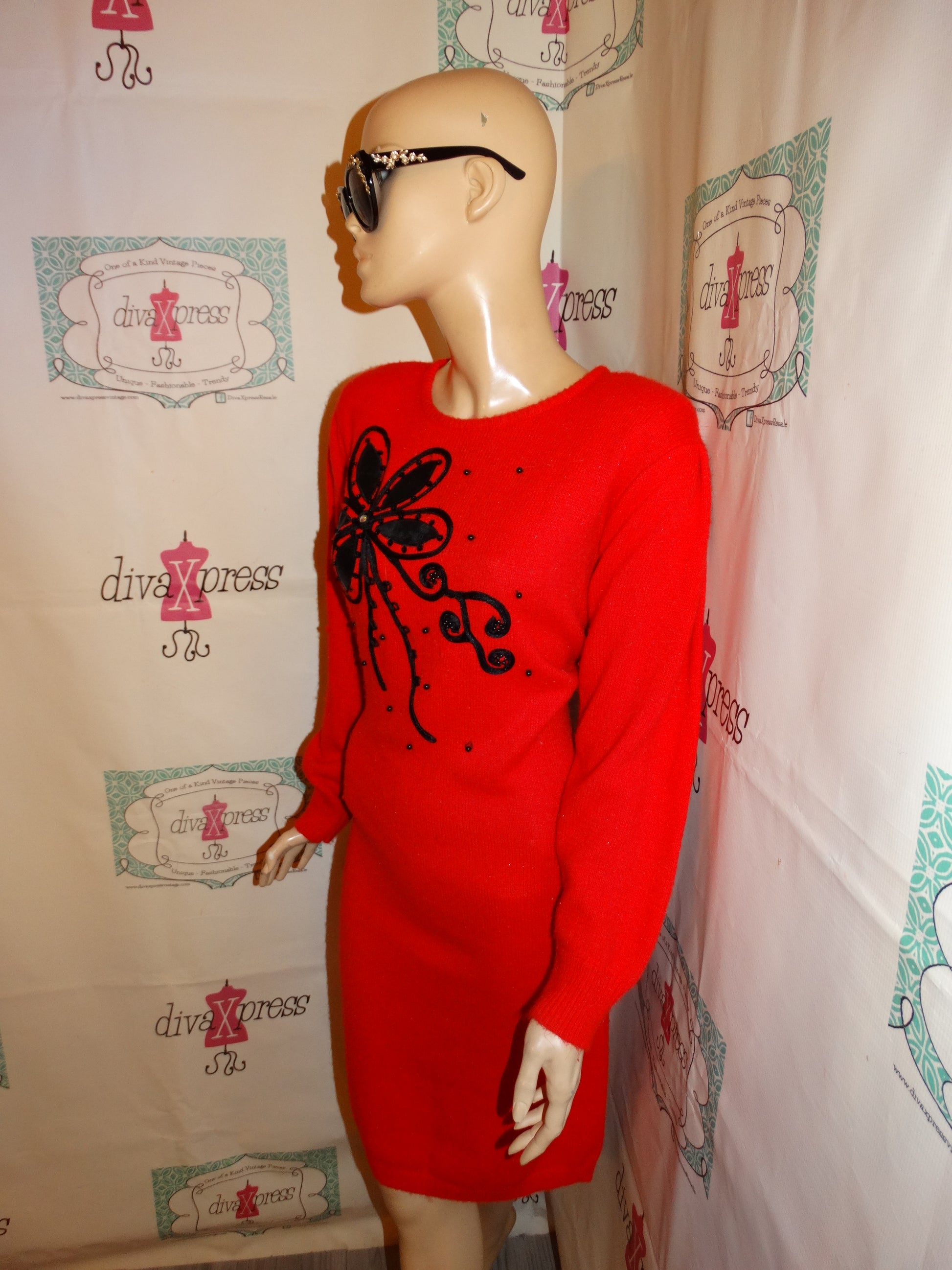 Vintage Siliver Leaf Red/Black Leaf Sweater Dress Size M-L