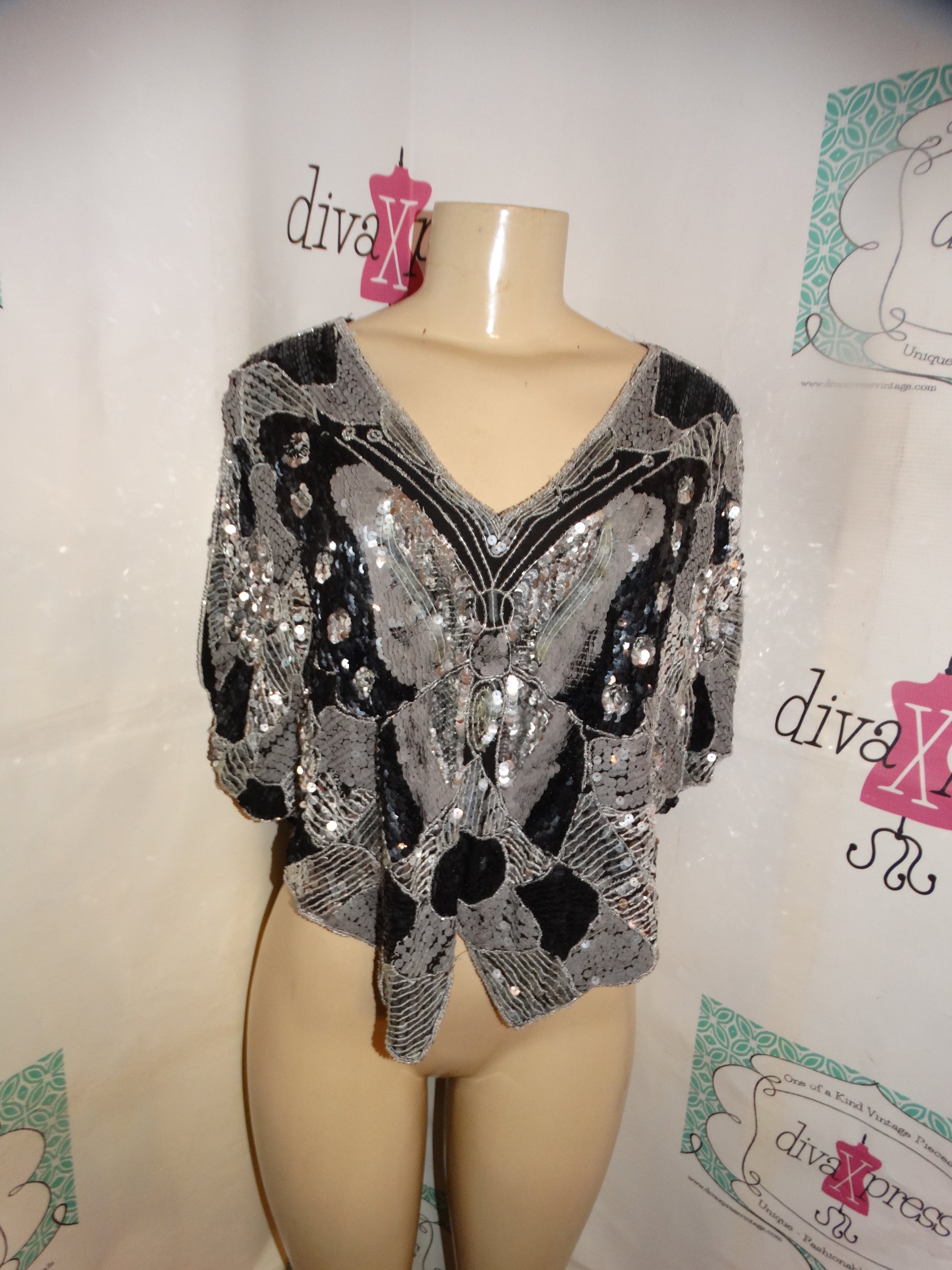 Vintage Stargroup Black Silver Sequins Butterfly Top Size M