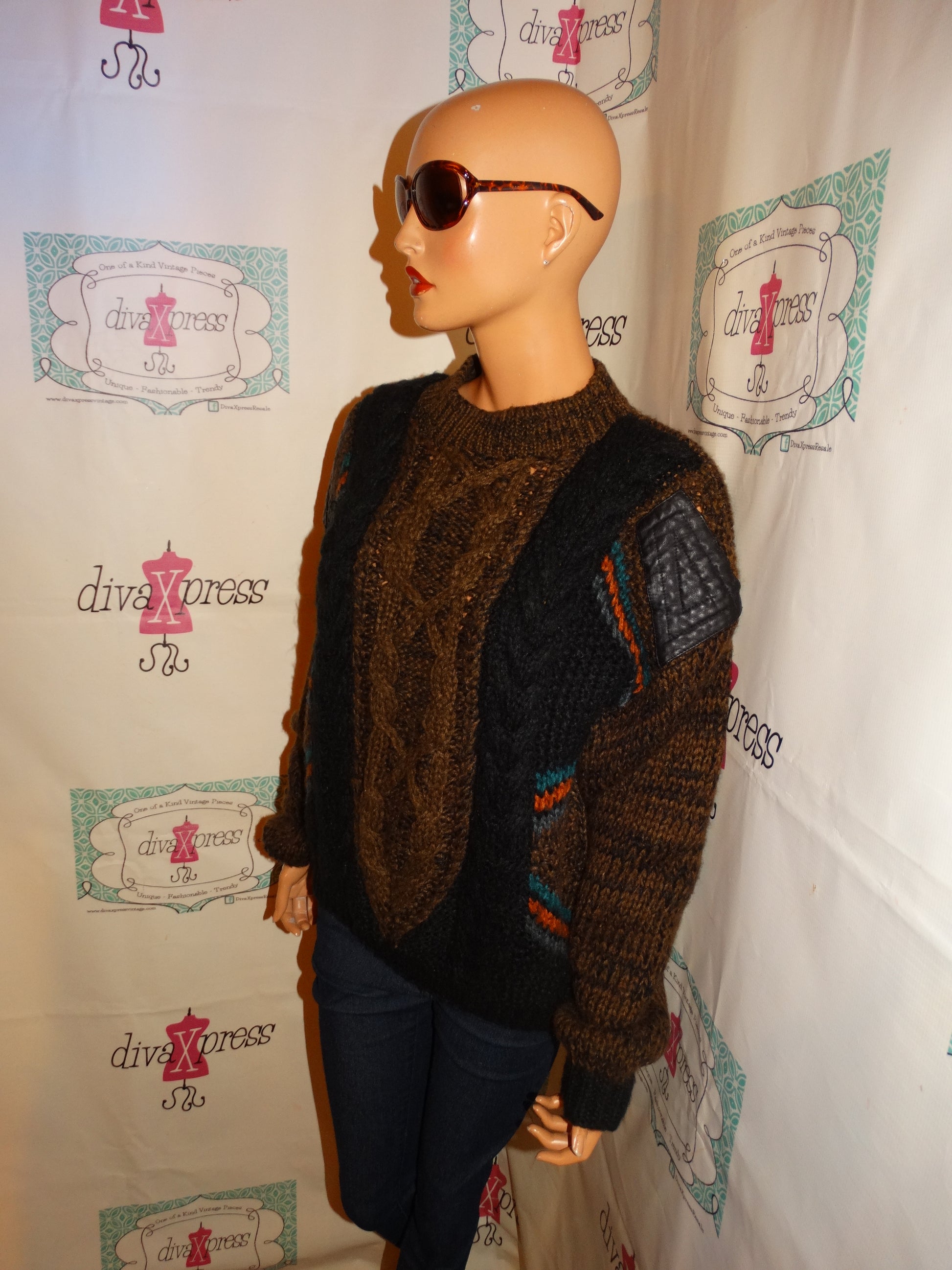 Up for sale is this lovely Vintage Street Scenes Green/Black Sweater Leather Patch Sweater Size L